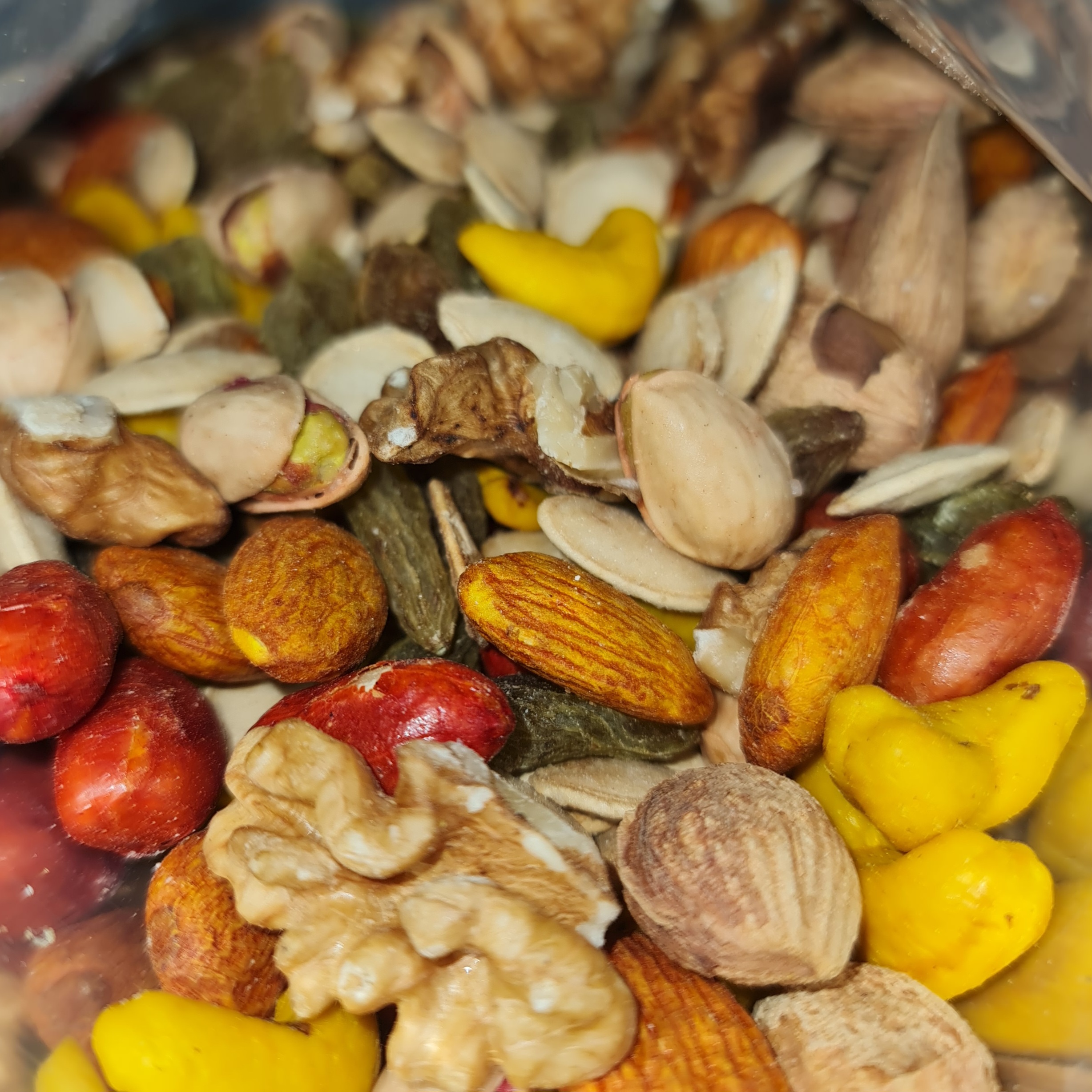 ترکیبات: هر کدام 200 گرم : پسته احمدی نمکی - بادام هندی زرد - تخمه آفتاب گردان s300 - تخمه کدو نمکی - آجیل 8 مغز - نخود و کشمش - بادام درختی نمکی تک پوست
